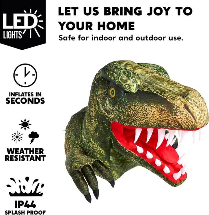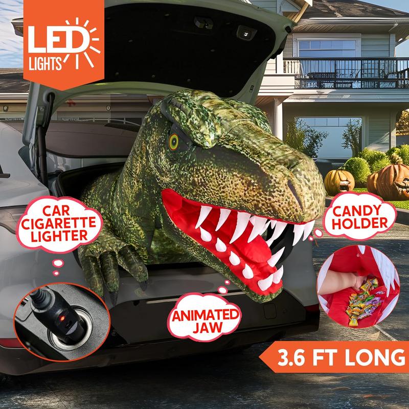 Excellent Design. This 3.6 ft Halloween inflatable dinosaur has a self-opening mouth and bright LED lights. The attention to detail in its dinosaur form, complete with sharp teeth and menacing eyes, adds an element of spookiness to your Halloween decor.This inflatable comes with an extended cord, fastened ropes, built-in sandbags, and a car plug with UL certification.
