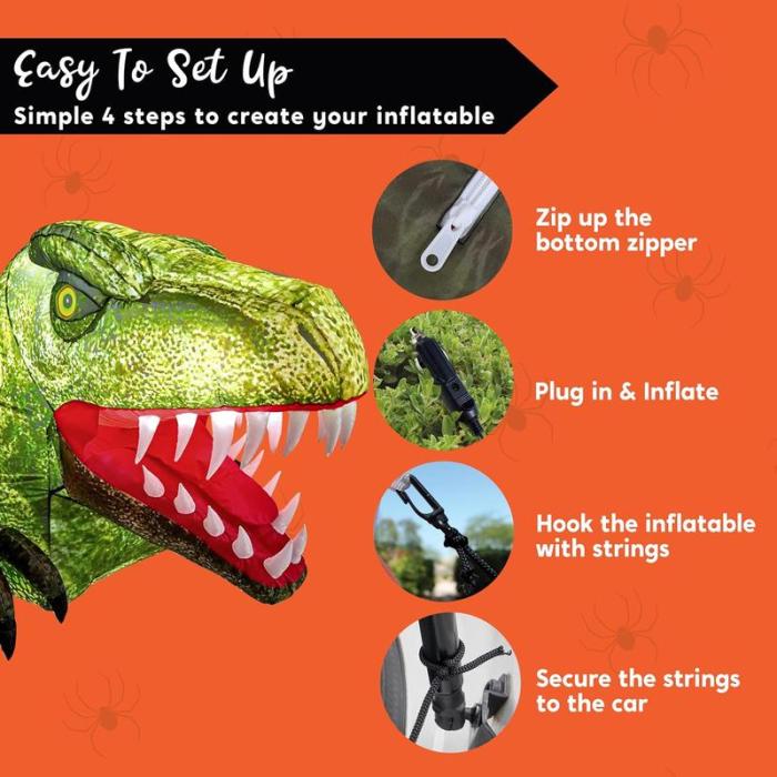 Ease of Use. Setting up and using this inflatable dinosaur is simple and hassle-free. It comes with a user-friendly air pump that allows for quick and effortless inflation. With its compact size and lightweight design, it is easy to store and transport, making it convenient for seasonal decorations.