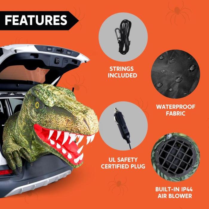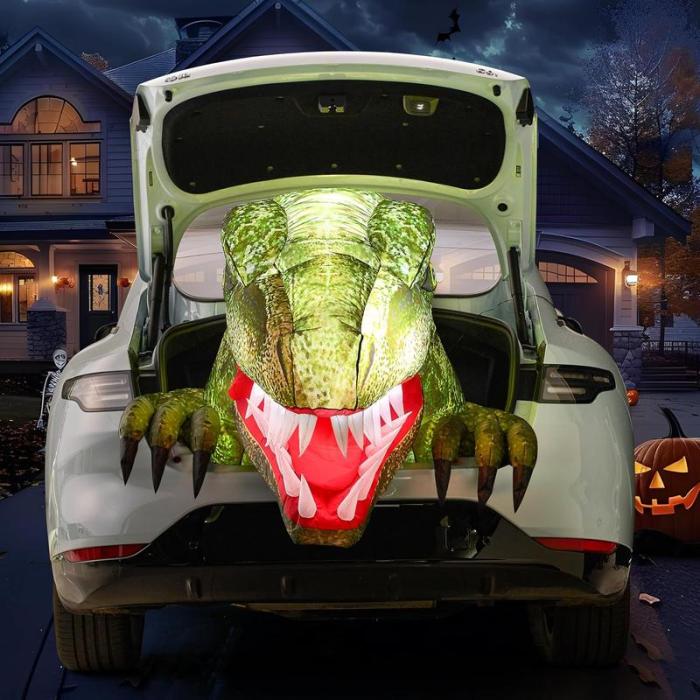 A Variety of Usage Scenarios. This inflatable dinosaur is versatile in its usage scenarios. It is not only a Trunk or Treat Car Decoration, but also can be used to enhance outdoor Halloween displays in yards, gardens, or even at holiday parties. Its adaptability allows you to create a spooky atmosphere wherever you choose.